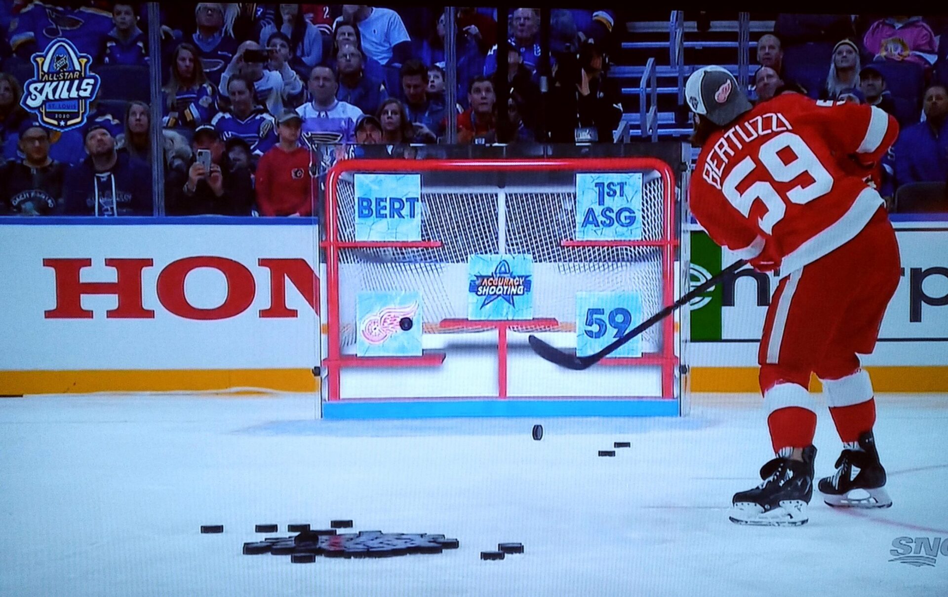 So you had some of the NHL’s best players like Tyler Bertuzzi firing pucks at the virtual targets on the screen, which had me thinking, how will the screen survive???