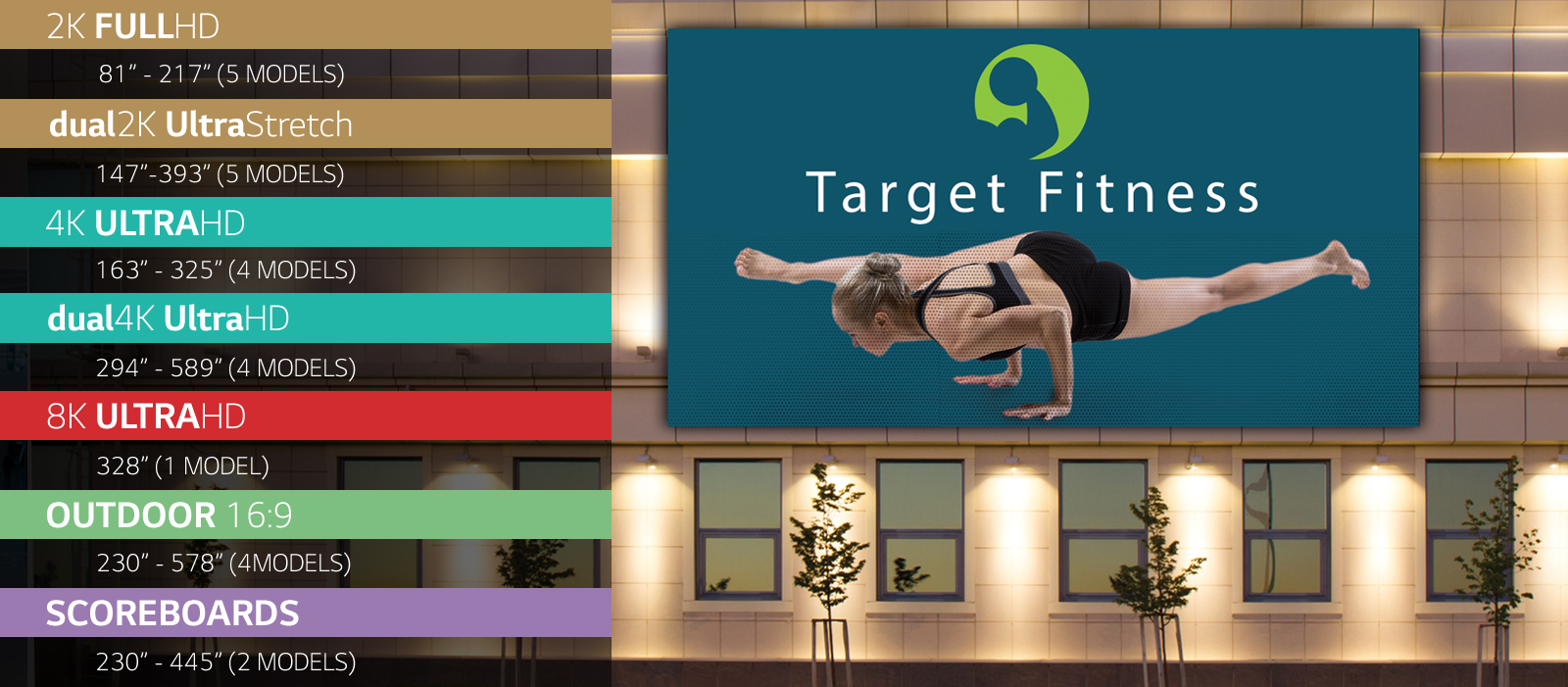 LG has created 25 unique Direct View LED display bundles that include both indoor and outdoor DVLED displays with Full HD to 8K Ultra HD resolution and sizes from 81 inches to as large as 589 inches.
