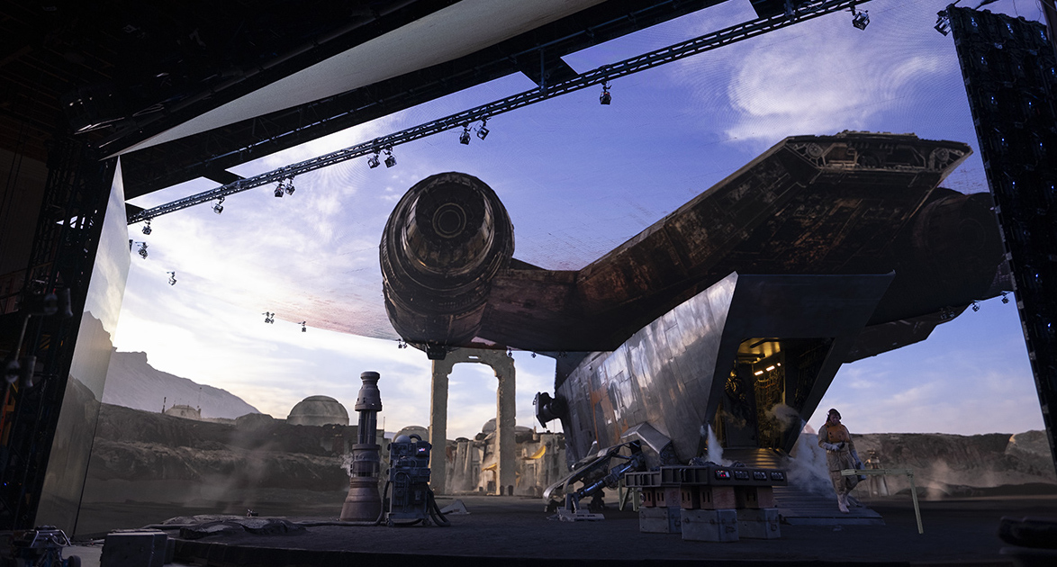 “Digital 3D environments created by ILM played back interactively on the LED walls, edited in real-time during the shoot, which allowed for pixel-accurate tracking and perspective-correct 3D imagery rendered at high resolution via systems powered by NVIDIA GPUs. The environments were lit and rendered from the perspective of the camera to provide parallax in real-time, as if the camera were really capturing the physical environment with accurate interactive light on the actors and practical sets …”