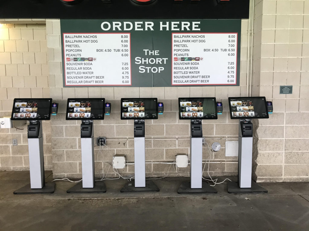 The stadium – Globe Life Field – is using a pile of interactive self-service ordering screens, running software from Appetize.