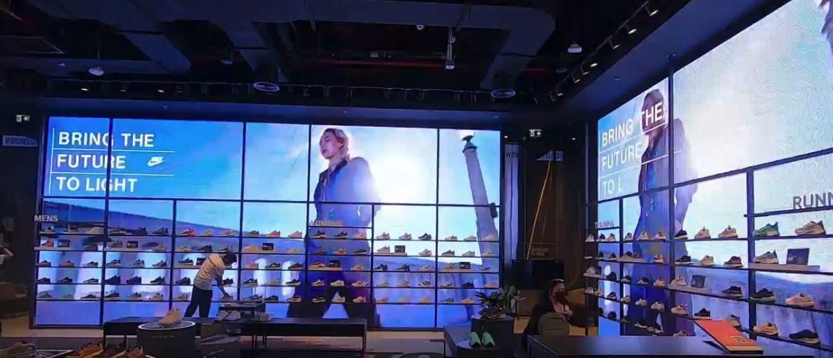 The Linkedin post doesn’t have any detail, but the store entry has an LED canopy and flanking walls, and back into the store, the sneakers section is lined with DV LED walls, with the shoe merchandising right in front of the screens.