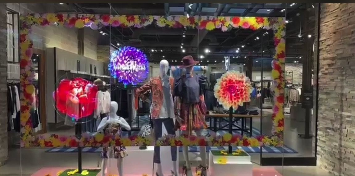 Here’s another example of those madly spinning LED light wands being used effectively as part of window displays – in this case a merchandising window at a Nieman-Marcus.