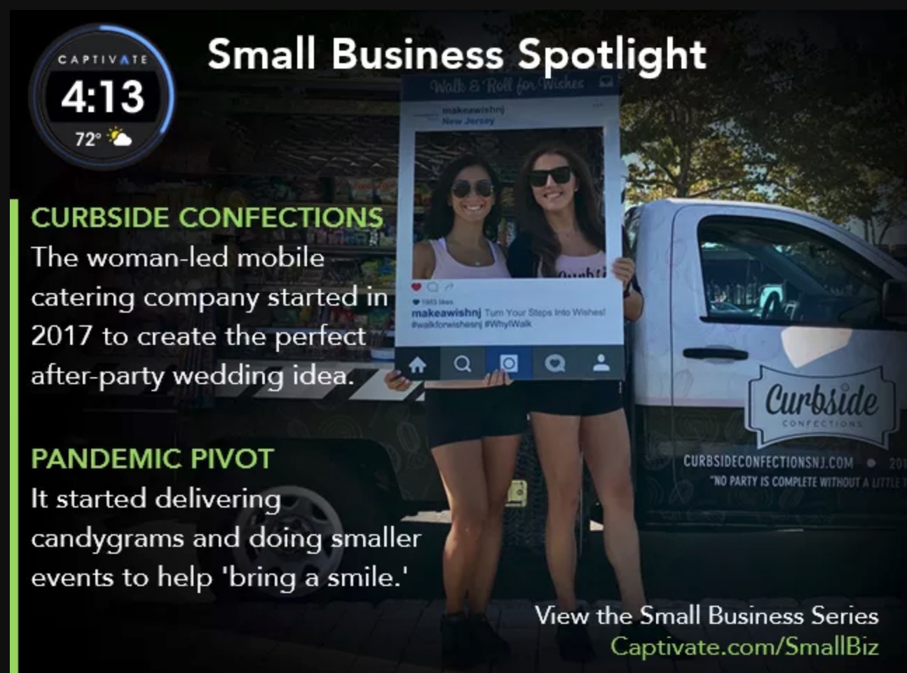 Captivate’s Small Business Spotlight series allows small business owners to submit their story and ad to be featured on Captivate’s network of 11,000 elevator and large format screens, in both office and residential buildings.