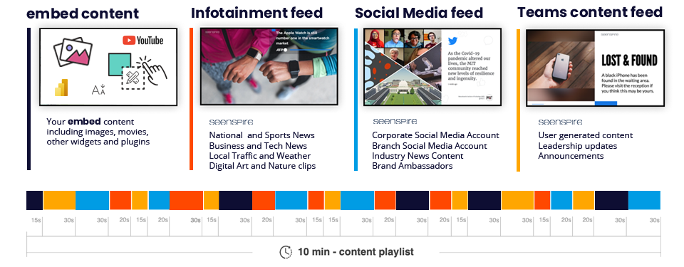 “We have seen a rise in customers looking for ways to automatically update their screens with a wide variety of content from sources they already have, such as LinkedIn and Microsoft Teams, but also further diversifying their playlist with Infotainment feeds such as news, sports, digital art, stock quotes,” says embed’s Drew Harding. “Partnering with Seenspire is a great fit, as not only does the content look great, but the streaming service has lots of tools to allow both automated and manual curation and customization of the content.”