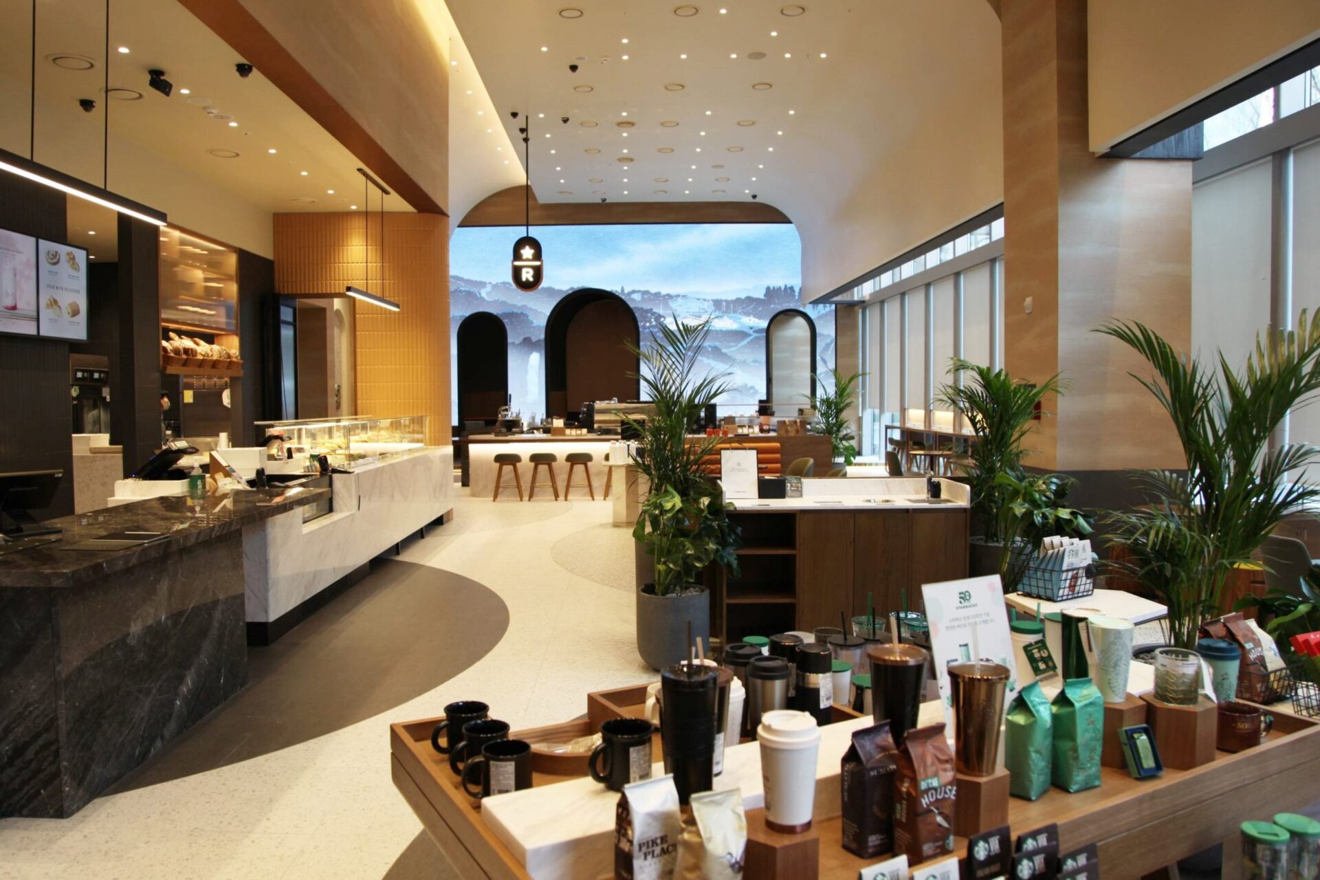The interior of the store features a spacious coffee seminar area, a cozy fireplace, and a large digital art wall installation that visualizes Starbucks coffee stories. The first digital art wall series includes illustrated scenes from Starbucks coffee farm Hacienda Alsacia, Puerto Rico, by local artist Lee Kyu-tae.