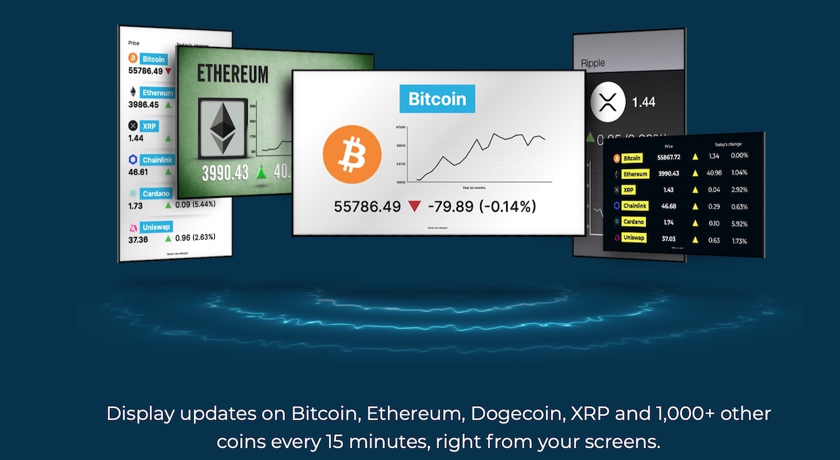 Cryptocurrency as digital signage content is available as part of in the Financial Graphics product from Screenfeed. It features 1,000 different coins to watch on your screens, or offers an individual view for single coin updates. Popular choices include Bitcoin, Ethereum, Dogecoin, XRP, VeChain, Cardano, Chainlink, Uniswap and so many more.