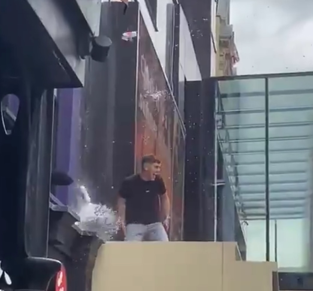 One of them scaled the canopy over the entry to the Odeon cinema in Leicester Square, which has a couple of large outdoor direct view LED screens on its facade – put in and managed by Peter Critchley and the folks at Beaver Group/Trison. One is pretty much right behind the lager lout, and gets hit repeatedly.