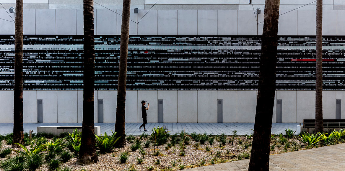 The Datascape wall is 96 meters wide, or roughly the length of a football pitch. It is on a wall on what is known as Moriarty Walk, down by the harbour. The work is by digital artist Ryoji Ikeda.