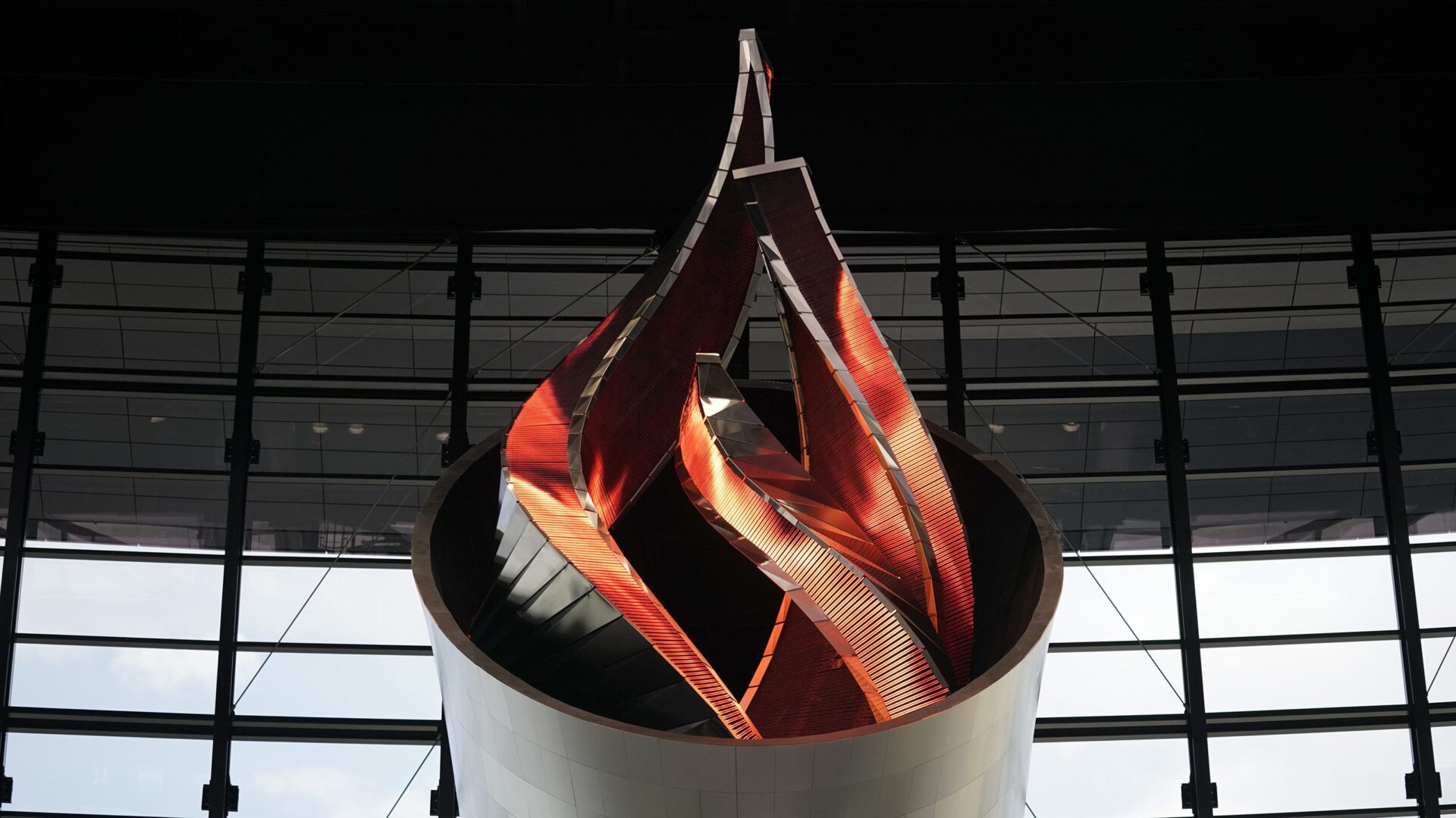 The torch sits on a superstructure on the mezzanine level of the flashy new stadium.