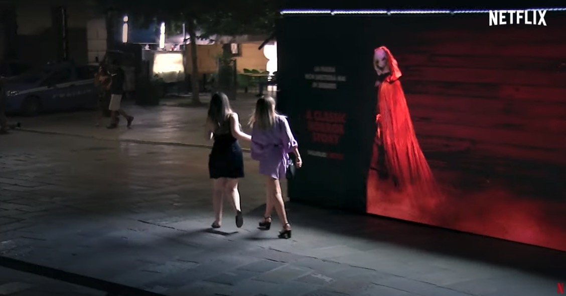 This is a pop-up marketing display in Milan for a horror series on Netflix – using a blend of an LED display, sensors and live actors to scare the crap out of people walking past.