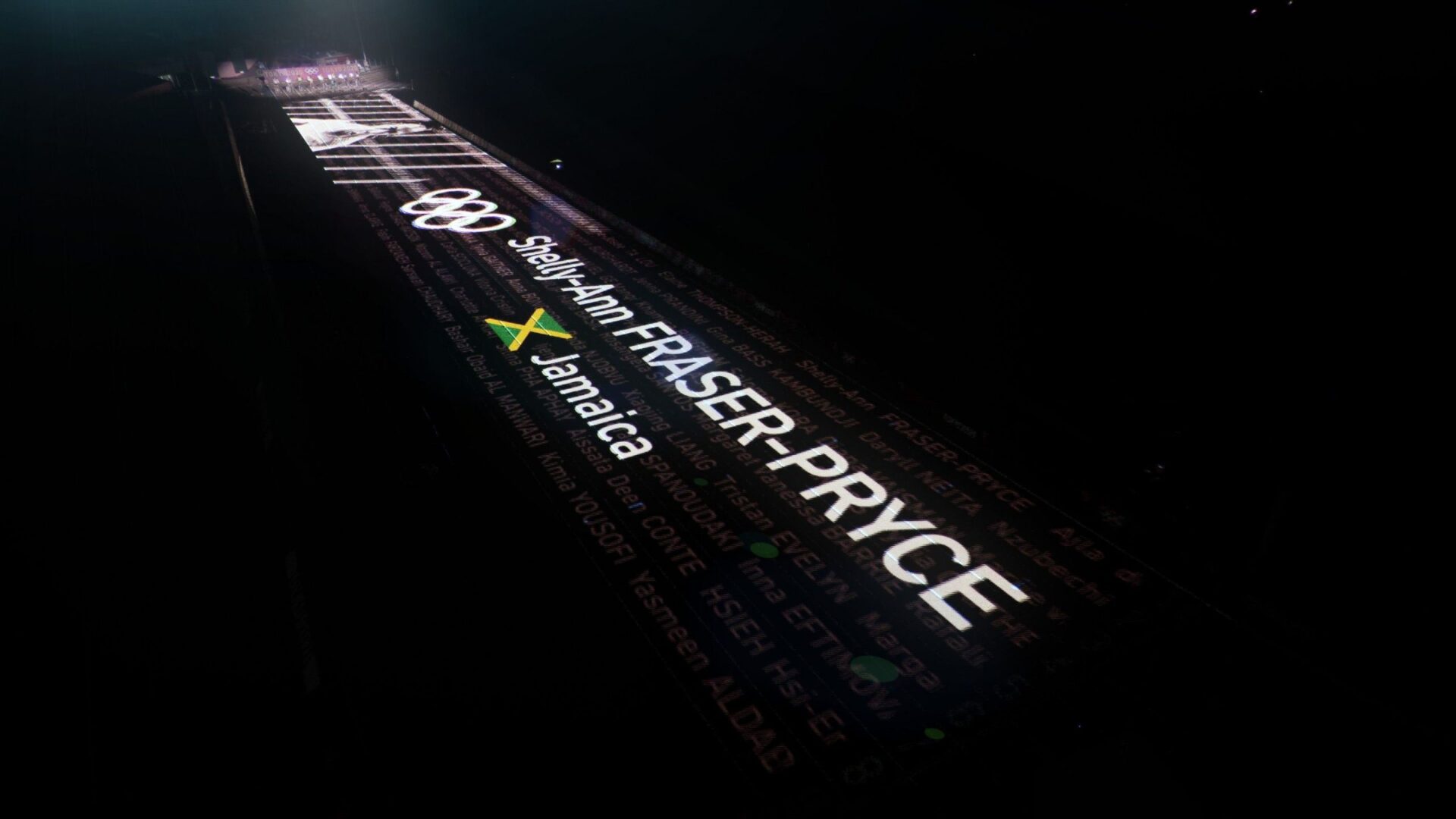 The stadium was darkened and the full length of the sprint track was projection-mapped down to each lane, and each finalist profiled with dedicated visuals.