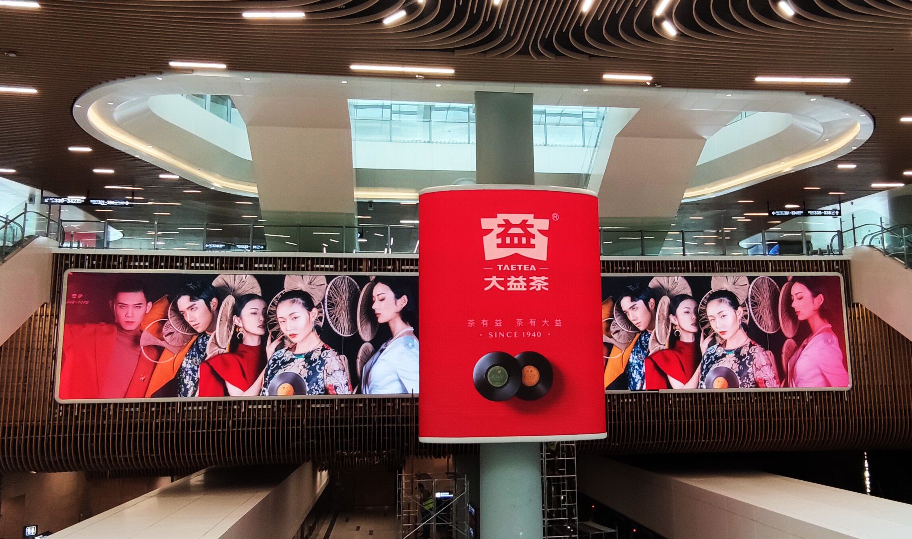The big bulkhead between the up and down escalators is visually interrupted by a very large vertical support column. The standard solution would be to put separate LED displays on both sides. But in this case, LED manufacturer AOTO developed a solution that wraps around the column and joins the two flanking screens.