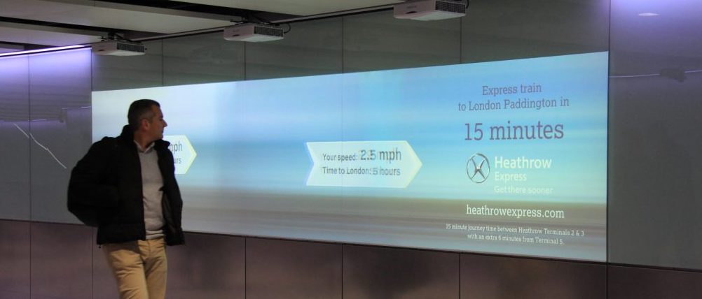 A UK AV and creative company called Arcstream has a program for the high speed line, coming out of T2, that mashes up short-throw projectors mounted on a concourse ceiling that uses the Kinect sensor to analyze walking speed and flash a personalized message that suggest at that pace it would take four hours, or whatever, to walk into central London, but would take 15 minutes on the train.
