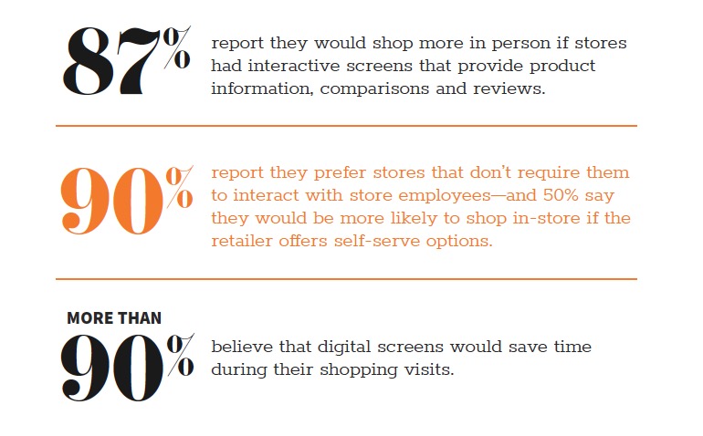 - 80% of under-30 shoppers are more likely to shop in person than online if a store has interactive screens with product information, product comparisons and/or reviews.