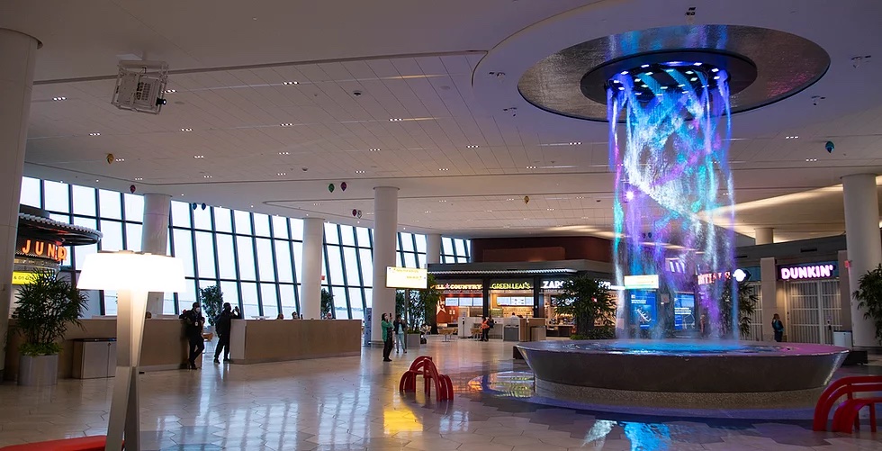 As you pass through the terminal, be sure to spend some time marveling at our Terminal B Water Feature. Located post-security on Level 4 of the Arrivals and Departures Hall, the water feature is the only one of its kind in the Americas and the only one of its kind in the world located in an airport.