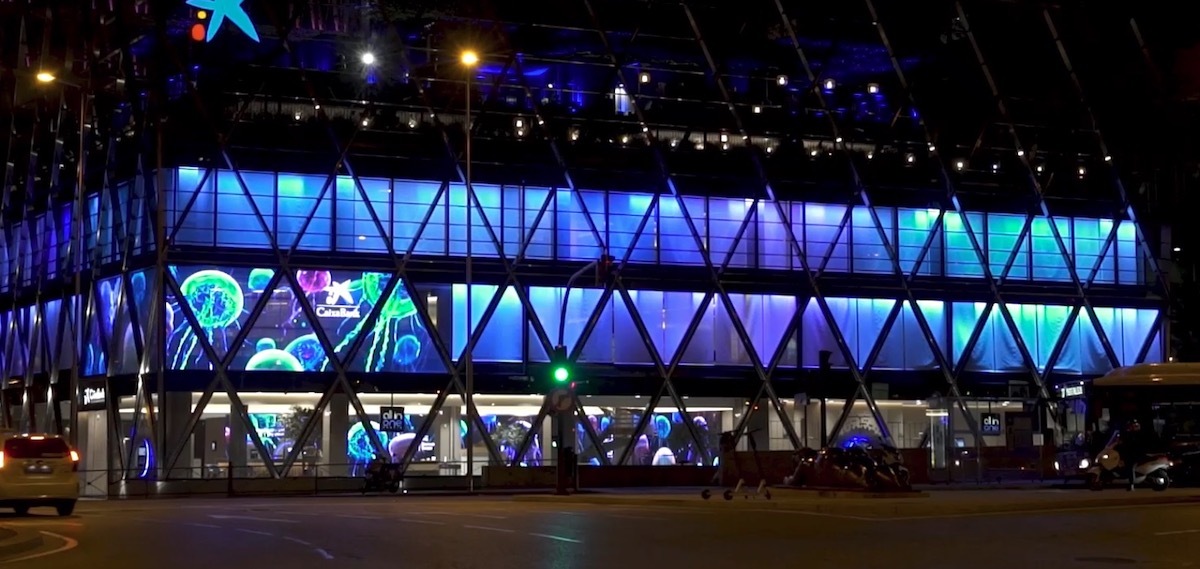 This is a flagship Caixabank branch in Madrid, in Plaza Colón, that uses much of the facade of a Norman Foster-designed building as a screen.