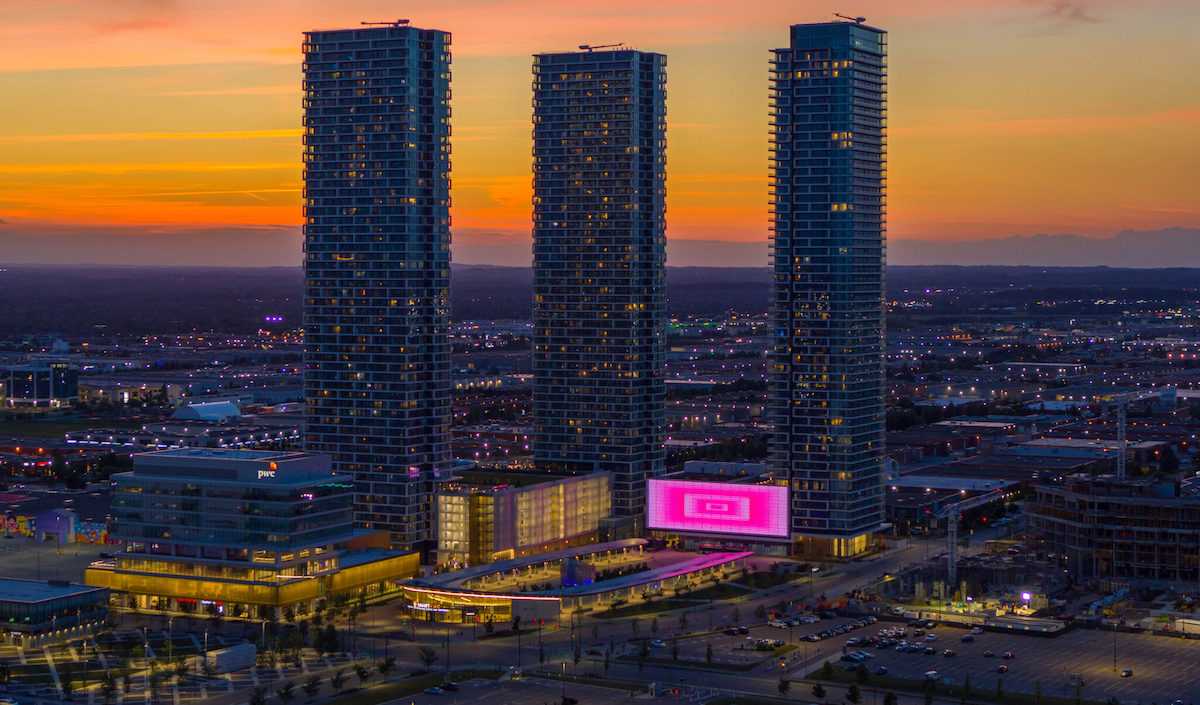 The outdoor display is billed as Canada’s largest low rez digital display – “a massive 10,000 square foot programmable luminous art wall (that) is a beacon for the City of Vaughan and beyond.”