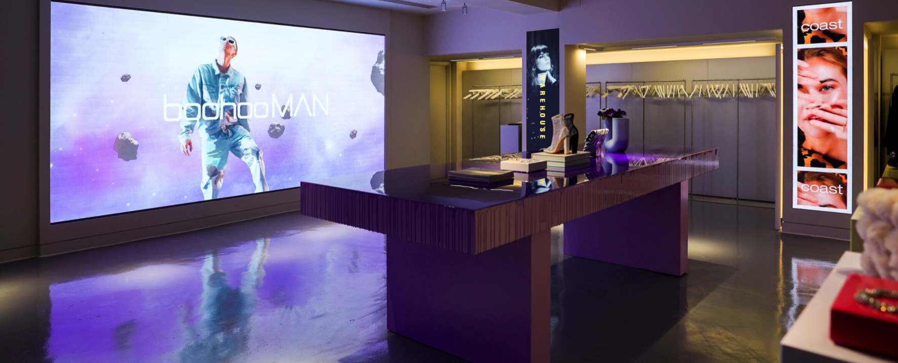 Despite not operating in physical stores, Boohoo do invest in their corporate spaces. The company enlisted London-based solutions provider inurface media to transform their new London and Manchester offices, generating day-to-day visual interest but also playing host to new season launches and fashion events.