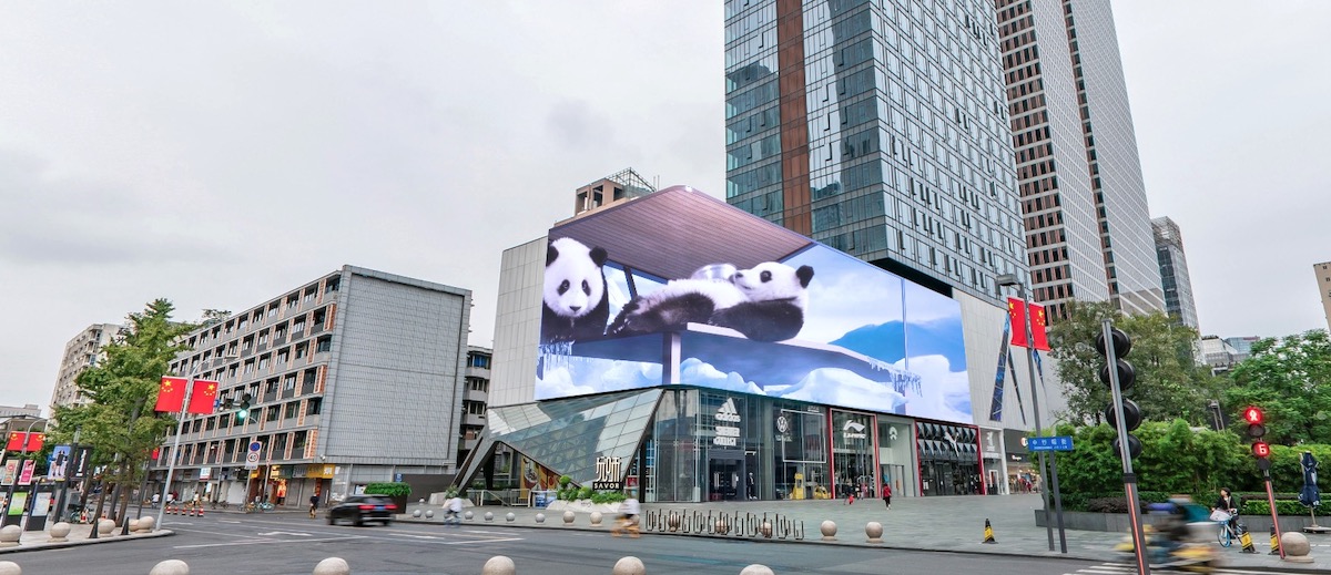 This is a nice “forced perspective” aka “anamorphic illusion” creative piece done on a wraparound 90-degree corner LED billboard in Chengdu, China.