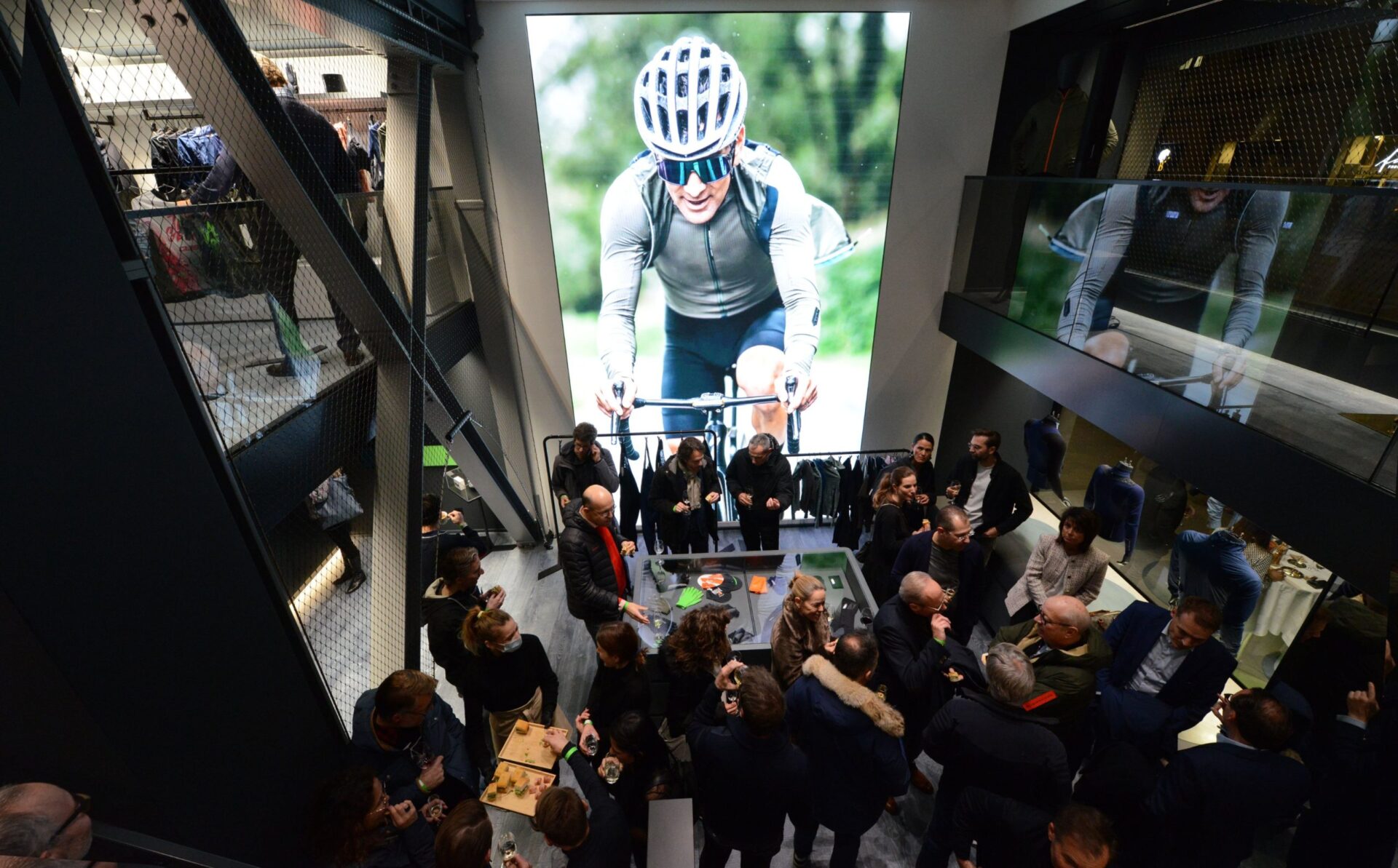 This is a recently-opened flagship store of the cycling-focused retailer Q36.5 in Zurich – a two-level venue that’s visually dominated by a big fine pitch LED that fills a feature wall.