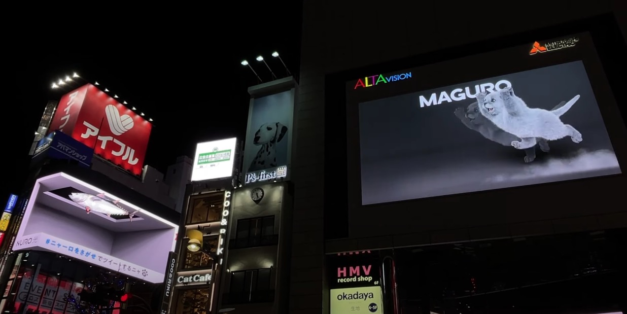 The displays are above and next to the Shinjuku subway station, which is said to be the busiest in the world, in terms of sheer foot traffic. The corner board above the station already got a lot of attention in 2021 when it was launched with a giant illusion of a different cat.
