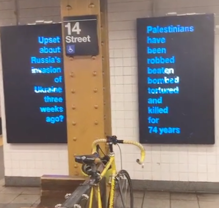 Let’s assume that New York contemporary artist Jonathan Allen did not have permission to go in – or have someone go in – to the New York city subway network this weekend and put printed film posters atop the digital OOH screens on the platform – making the political point that while what’s going in Ukraine is awful, so is what’s been happening in Palestine for decades.