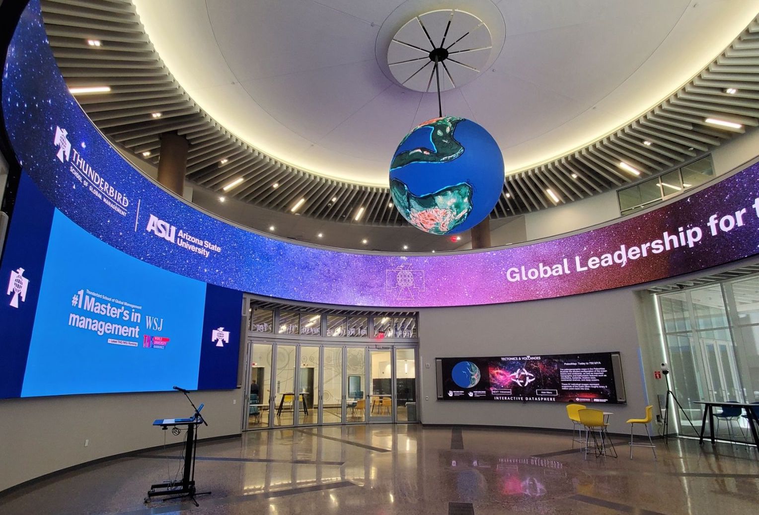 This is an early look at the new home of the Thunderbird School of Global Management‘s building at Arizona State University, and a lobby/common area that is visually dominated by LED displays.