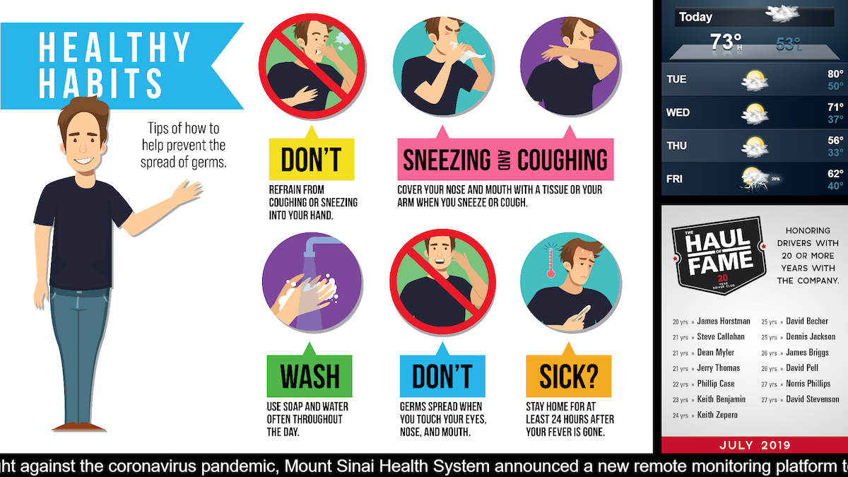 Screens are placed in high traffic areas, like the drivers’ lounge and the drivers’ main entry-point to the building, with the goal of engaging and informing them in the brief periods when they’re around company facilities. Each sign has a weather widget, news ticker, and company information. All the content is produced internally.