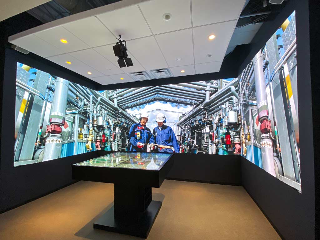 The theater is three adjacent 1.04mm pitch SNA Displays video walls set at 90-degree angles to create a highly immersive viewer experience, with an interactive touch-panel table that uses MultiTaction software that can throw visuals to the LED wall. The overall canvas is 7-feet-tall screens by about 31 feet wide.