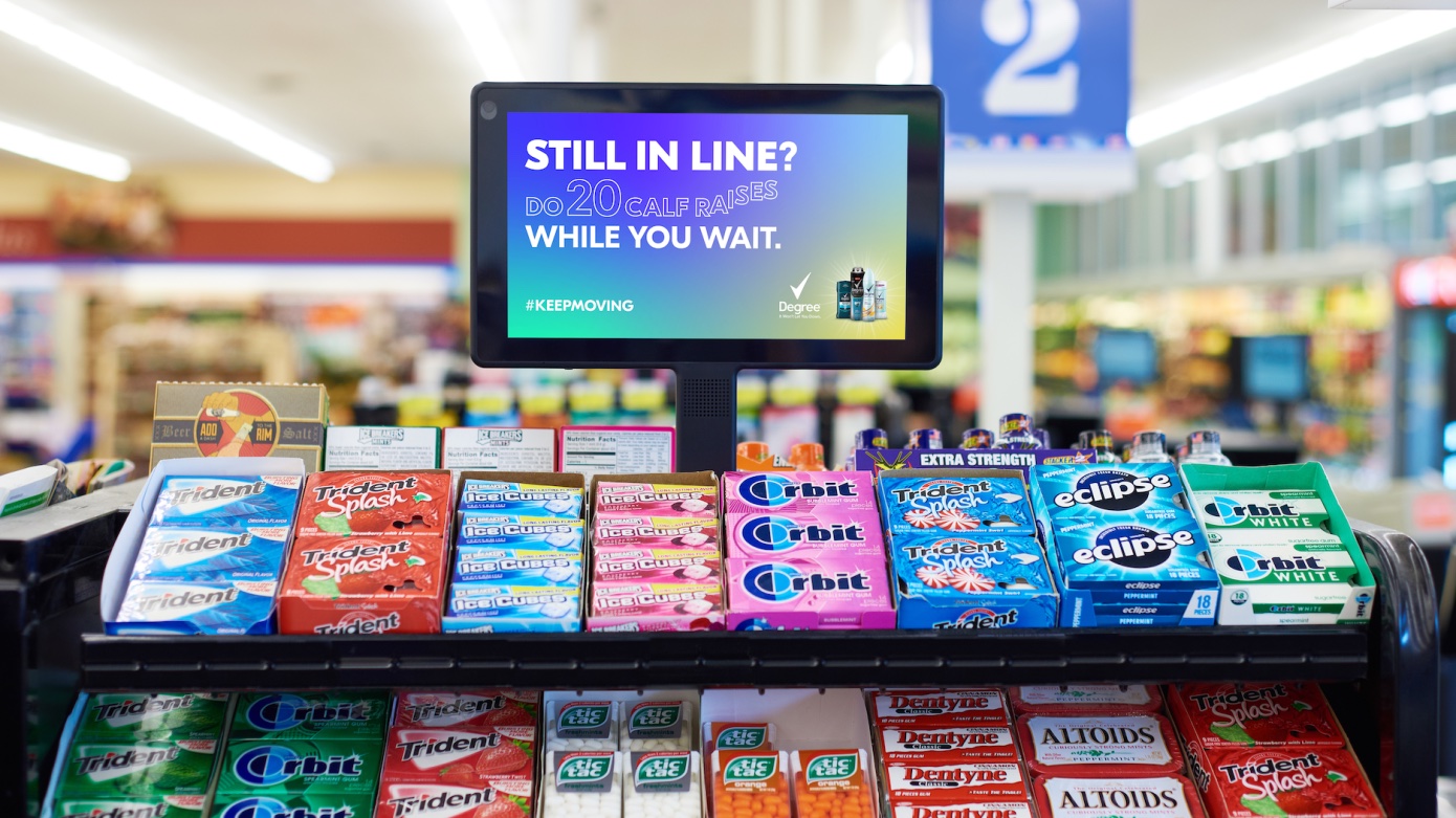 The screens, mounted atop checkout lane half-height shelves filled with impulse buy goods like candy bars, are now in 2,700 stores and all 50 U.S. states. A looming roll-out will push that number over 3,000. The average is five screens per store.