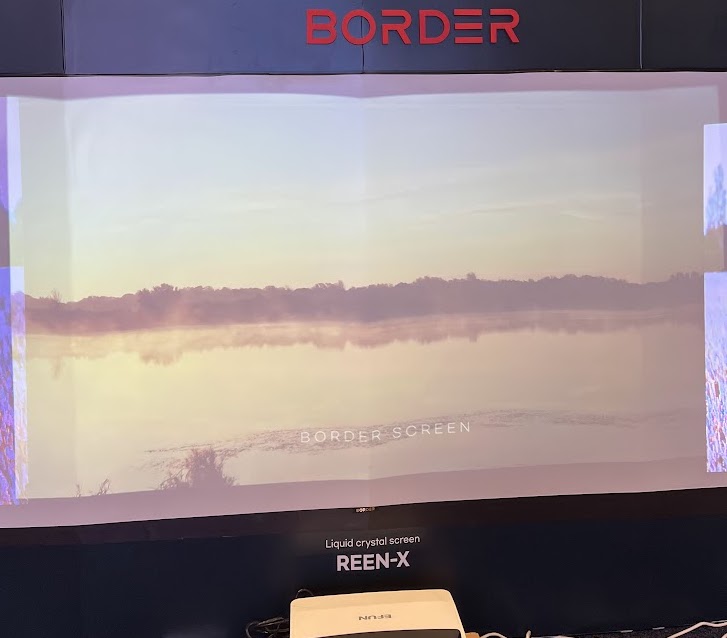 As with conventional fabric screens, Border’s tech works with any projector that will push out light. How good it looks will usually depend, in part, on brightness and projector distance. You can see in the main photo the company was trying to show what the film could do in a very brightly lit LVCC hall. You’ll notice the big projection companies find ways to reduce ambient lighting around their trade show stands.