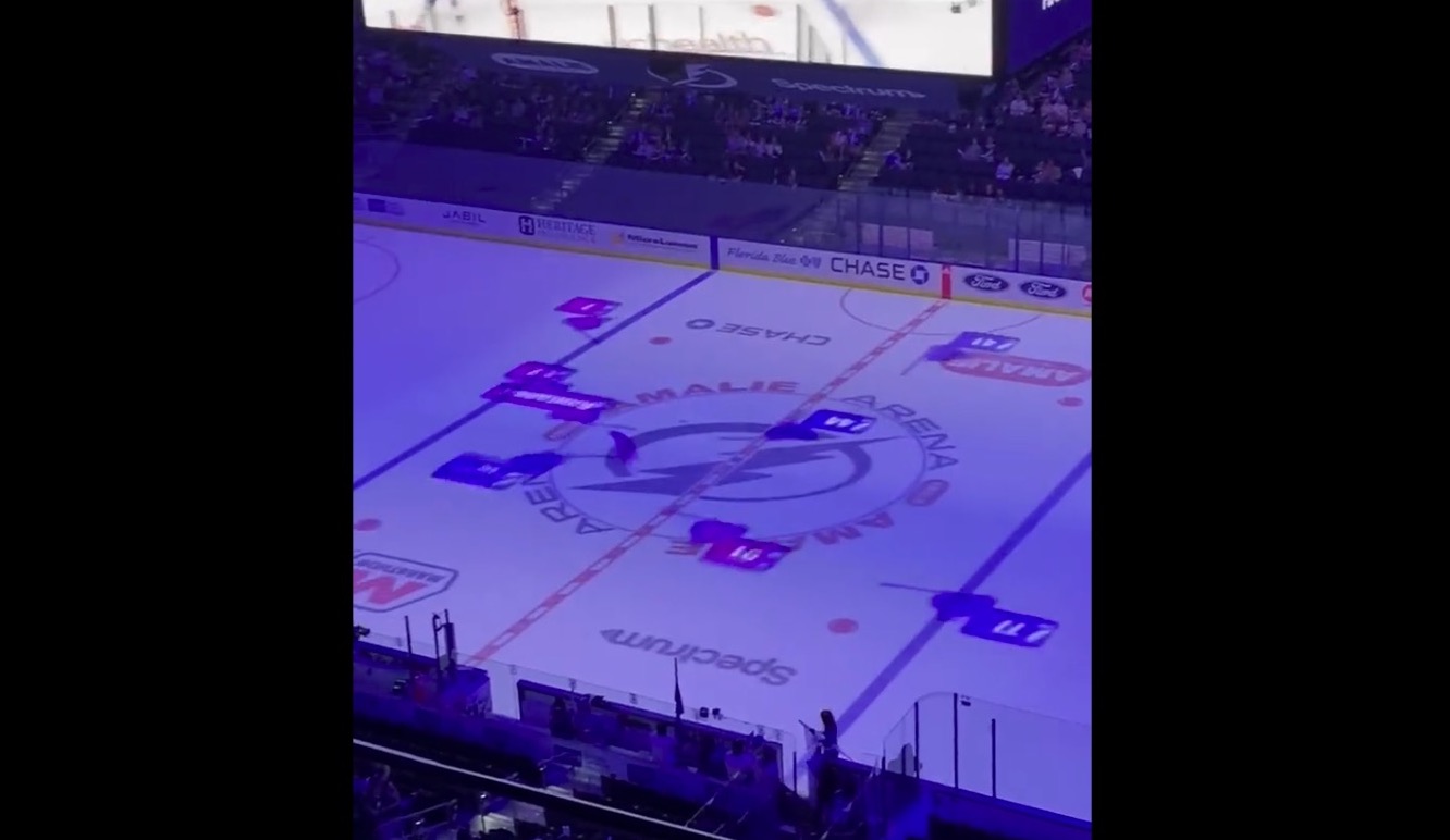 This is at the home arena of the NHL’s Tampa Bay Lightning, showing the game in Denver, in real time on LED display boards, but also projecting player movements and where the puck is. The projections were done for the Stanley Cup Finals, which just ended last night with Colorado winning the trophy.