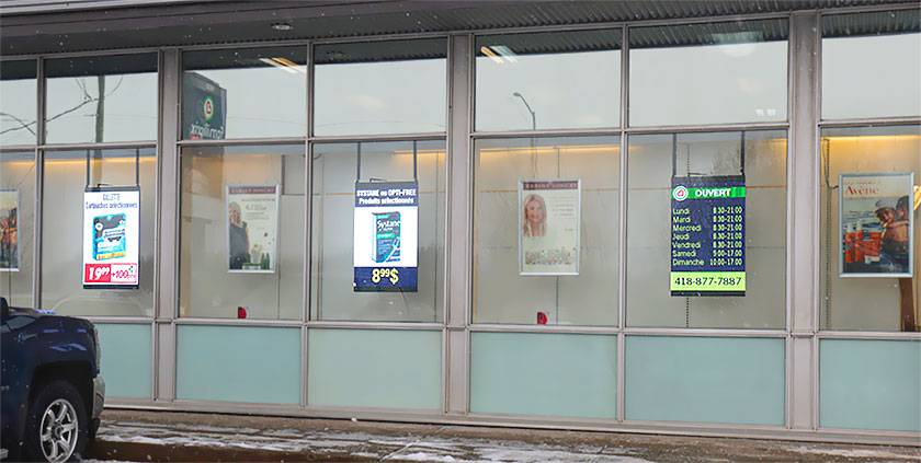Quebec City-based manufacturer Nummax has all the normal stack-and-tile as-needed video wall options for indoor and outdoor, but has also had a knack for developing finished solutions that meet specific needs, like these ring lamps. The company is marketing a set of in-window posters designed to compete with daylight-readable LCD displays.