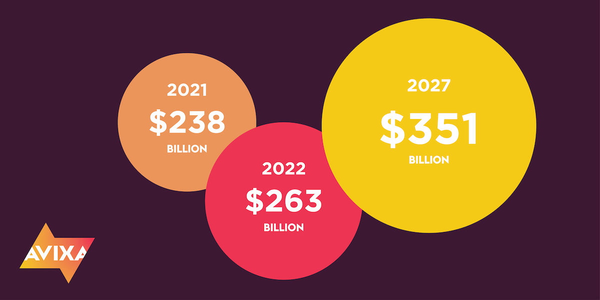 After a strong 2021, says the trade association, when pro AV revenue growth exceeded initial expectations and hit 11%, 2022 is set up to hit a new high-water mark for pro AV, reaching $263 billion globally. Growth moderates in the coming years to a compound annual growth rate (CAGR) of 5.9% from 2022 to 2027. While this is due in part to the slow-down in economic expansion across the globe, pro AV is still set to grow faster than most countries’ GDPs during the same period.