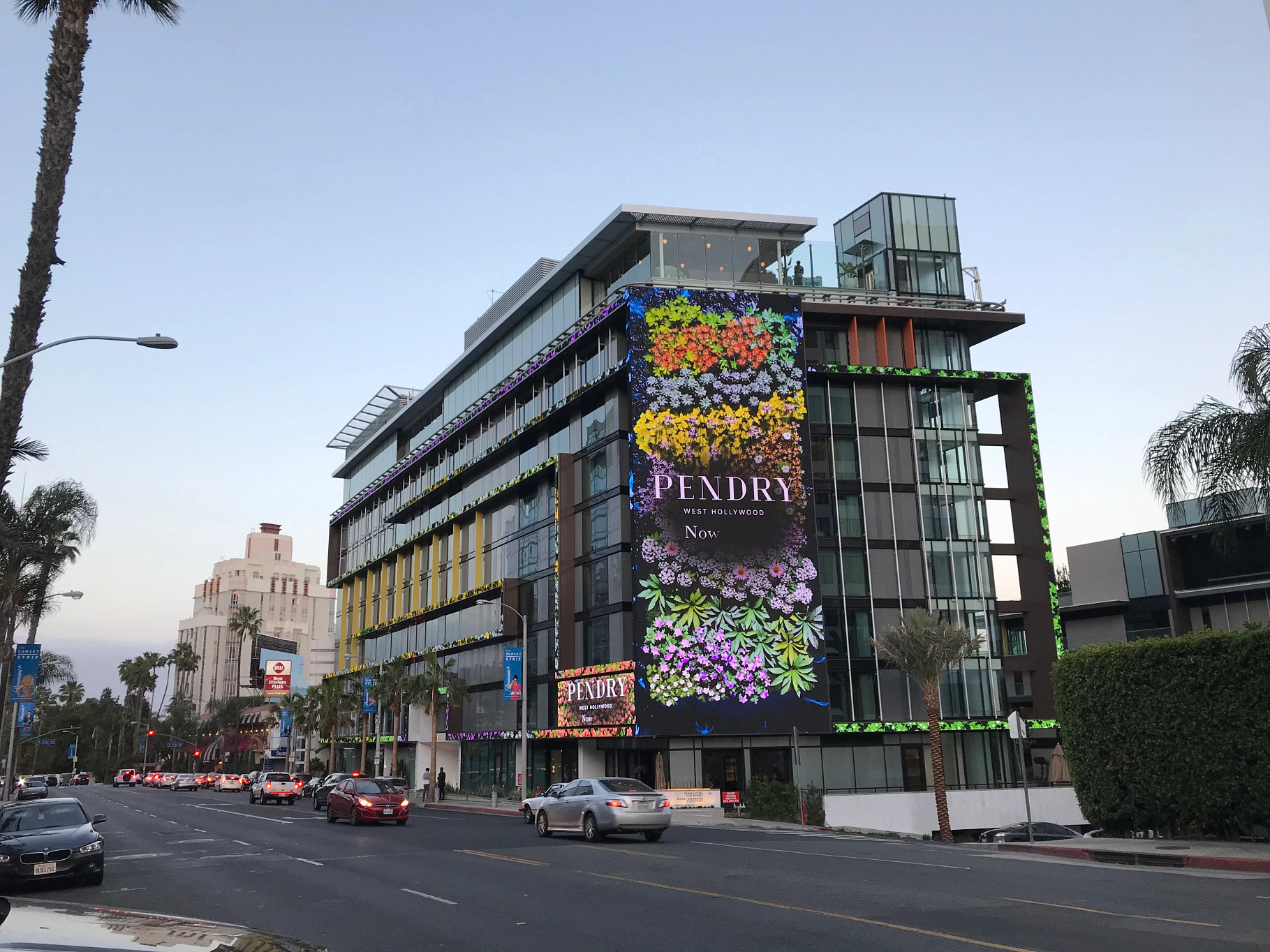 This is Pendry Residences in West Hollywood, a luxury hotel which has a very large main LED on one face of the building, and a smaller one flanking it. But it also has vertical and horizontal ribbon LEDs that sync with the content but also serve as architectural lighting. The video below suggests another board out of view, at the opposite end of the building.