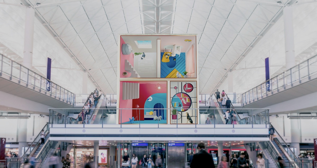 A big LED display on an elevator tower in the “meeters and greeters” area runs five different custom creative pieces, including a virtual aquarium, a “House of Cute” piece with pets, and a claw and catch arcade piece aimed at kids.