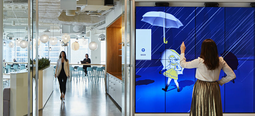 But in this sort of environment, where visitors may have time to kill as they wait for their host to come to reception, this set-up would be fine (though I wonder how much it gets used after the honeymoon/novelty period). Touchscreen surfaces like this are not thought to be particularly risky for transferring pathogens between people, but I suppose a gesture-based system removes the risk entirely. It also allows people to navigate without walking up, boinking the screen, and then stepping back to take it all in.