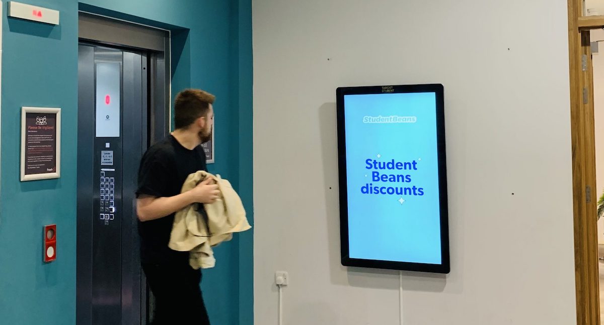 Target Student puts portrait-mode screens in for free in the highest footfall areas of large student housing “halls” in city centre locations. Its website says the company so far has 60 screens in 28 major locations. The company says its relationships with accommodation partners gives brands “exclusive access to untouched high footfall student living spaces across the UK.”