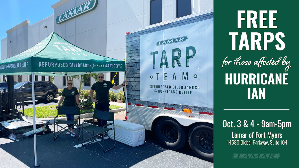Lamar has activated what it calls its Tarp Team program, donating and distributing used billboard vinyl to Ian-whacked communities. The company had a set-up outside its offices inĀ Fort Myers this week, with volunteers distributing the billboards on-site at no charge.
