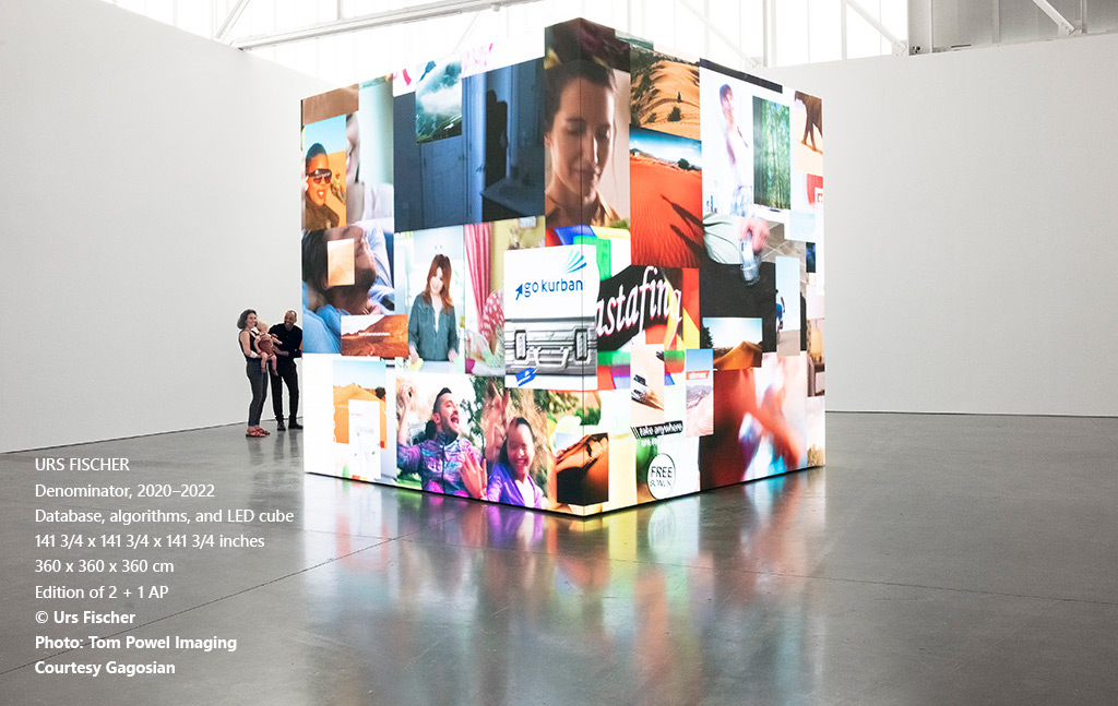 “Denominator is a 12-foot cube constructed from LED screens that display a sequence of fragments from international television commercials in a shifting composition that spans the history of the medium,” adds a Gagosian news release. “Through the use of AI algorithms, the commercials have been deconstructed into individual shots, which are then grouped by theme or color and displayed in layered patterns and choreographed sequences.”