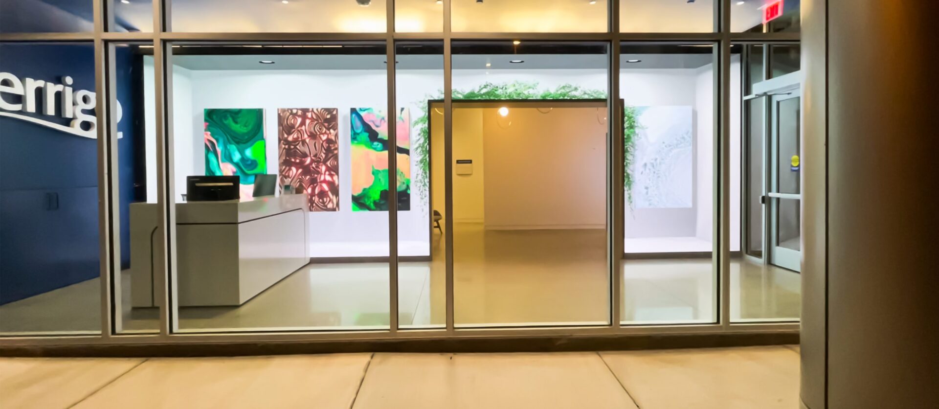 It’s a video wall at reception that Freshwater Digital, located up the road from Perrigo’s offices in SW Michigan, pulled together.