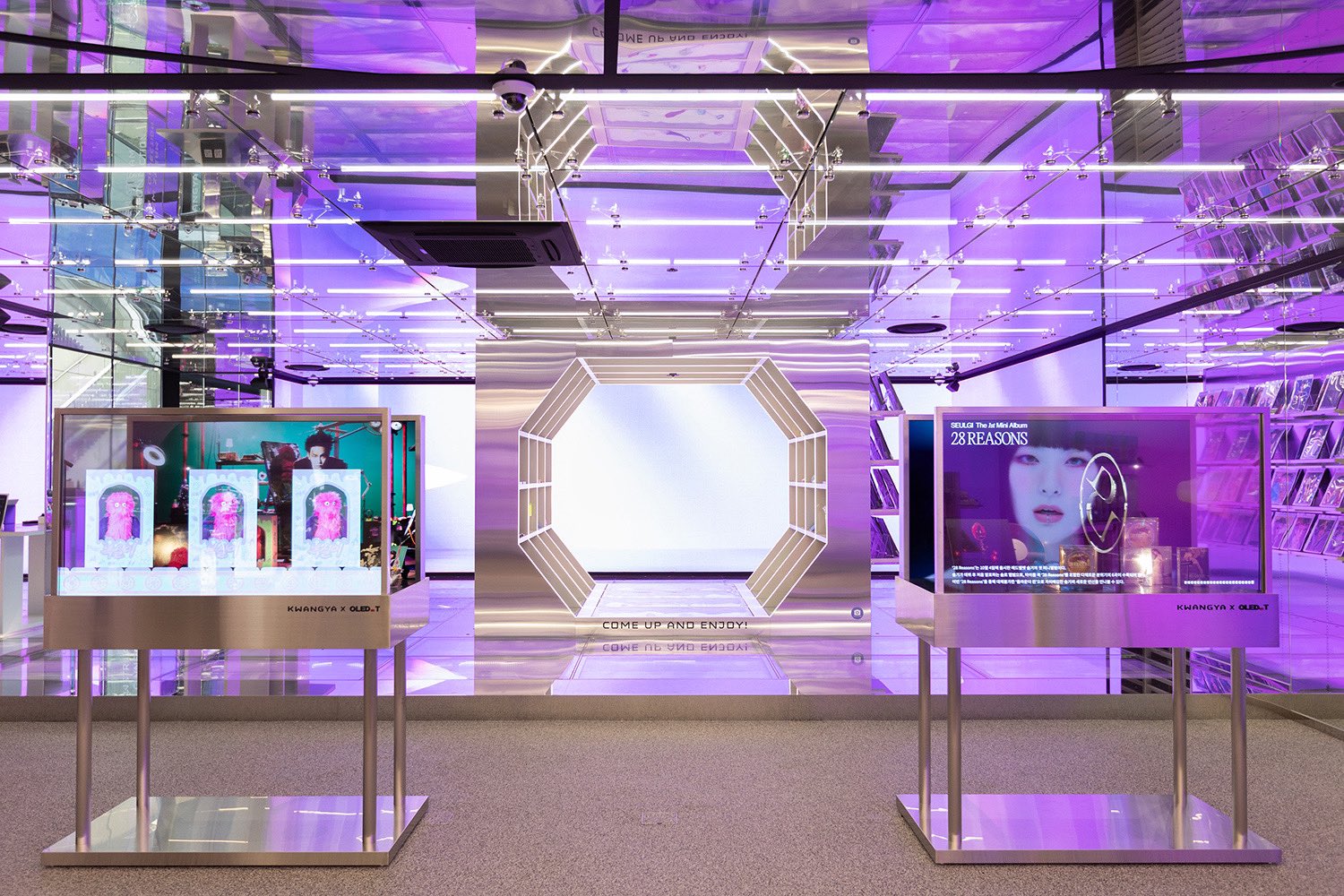 It stands to reason that a store in central Seoul that’s focused on K-Pop groups and their fans was going to be more manic than minimalist, so there are all kinds of screens at the flagship store of Kwangya.
