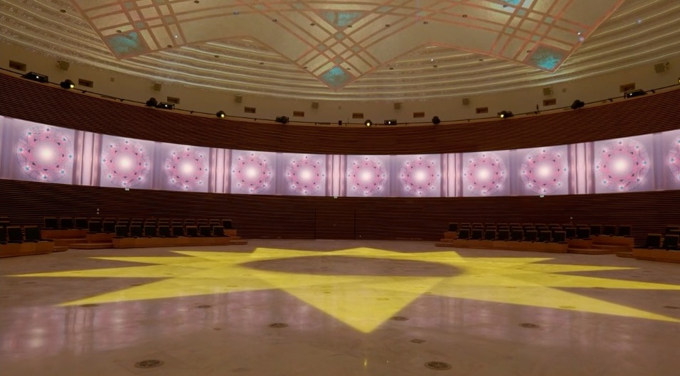This is a vast, custom-curved LED video wall in a main auditorium at Mohammed VI Polytechnic University (known as UM6P), located near Marrakech, Morocco – billed as the largest immersive video wall in North Africa.