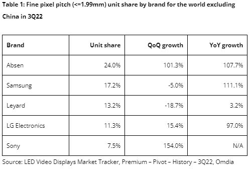 China is its own market, with countless domestic sellers, but globally, Omdia says Absen was the top manufacturer for sales of fine pixel pitch market in Q3. Interestingly, Sony is coming on.