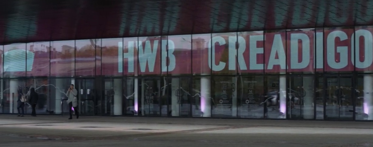 This is what LG says is the largest transparent LED film installation in Europe, running atop a set of windows at the entry to the Wales Millennium Centre in Cardiff, the main arts center for that country.