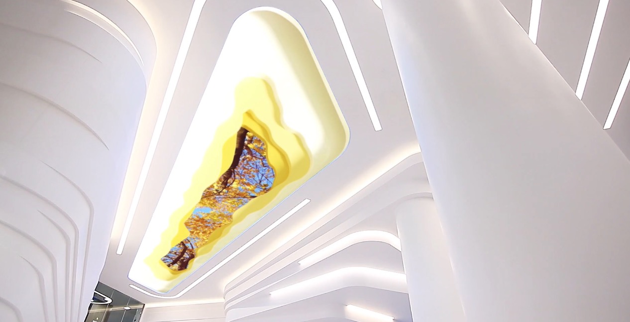 This creation, says Admemori in describing the project, “follows the interior architecture and plays trompe l’oeil with interior decoration materials. Like an open ceiling, this custom digital design creates the sensation of an opening moving outwards.”