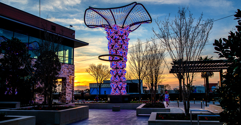 This is a 35-foot multimedia art tower that uses triangular LED panels to steadily change its appearance for visitors to a big multi-use destination in a suburb of Dallas. Called Grandscape, the 433-acre lifestyle center (which opened in April 2020) has 3.9 million square feet of retail, dining, and entertainment anchors.
