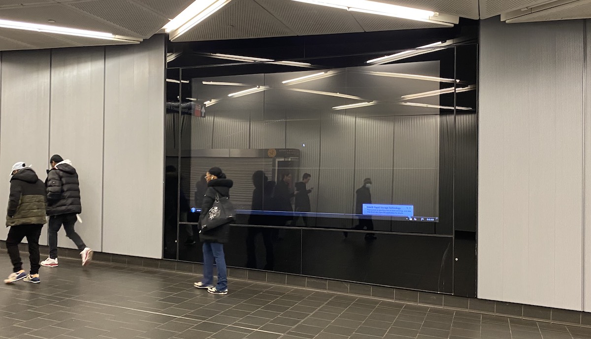This is a big video wall in one of the walkways connecting the World Trade Center are in New York with transport hubs. The error message has to do with hard disk storage.