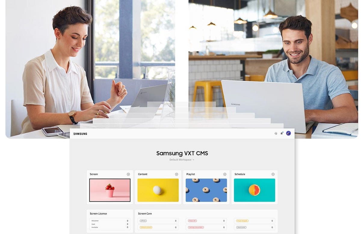 Samsung VXT CMS, the micro-site touts at the top, is “a cloud-based solution for digital signage that brings together flexible and efficient operation, faster setup and system recovery, and highly intuitive content creation and management capabilities to help businesses unlock the powerful potential of business displays.”
