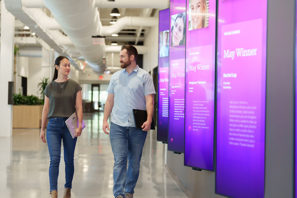The main Boulevard is an entrance hallway just past the lobby, making it one of the most high-traffic areas in the entire building. Knowing this, the company decided it would be an ideal space to highlight employee stories, company successes, value statements and messages welcoming honored guests.
